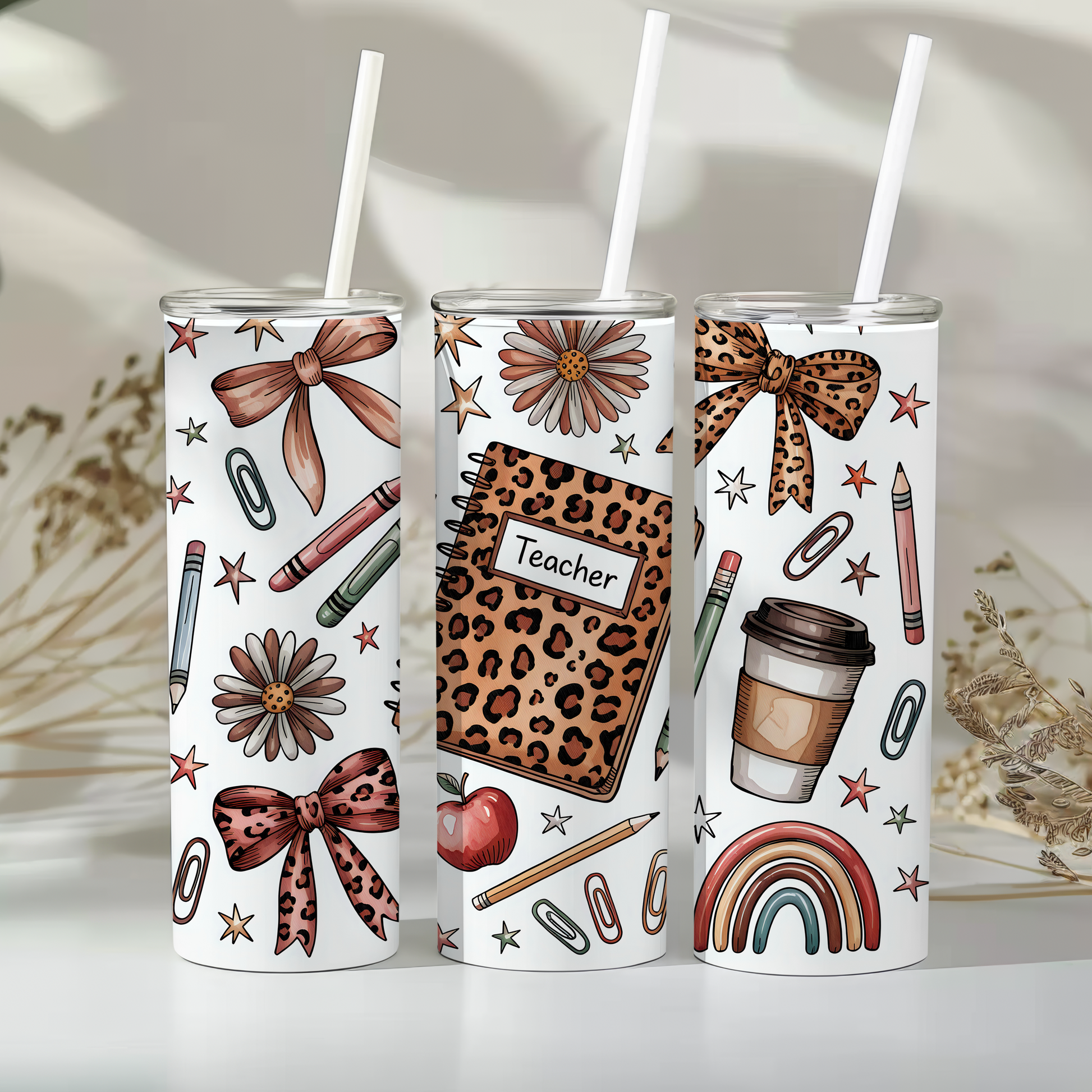 This 20oz white stainless steel tumbler brings all the neutral vibes with leopard print bows, a cozy brown coffee cup, and soft, earthy tones that say “I educate, but make it fashion.”