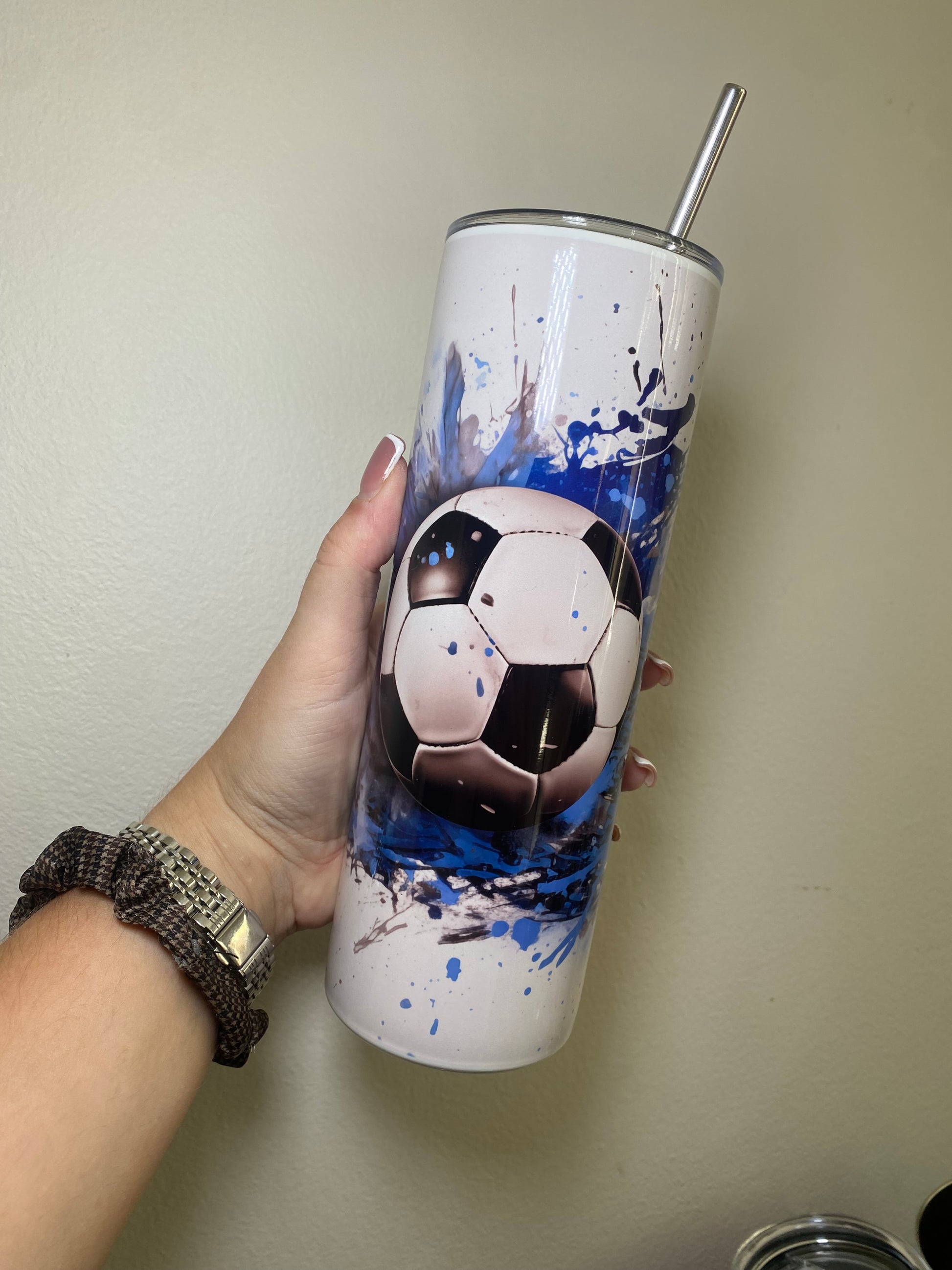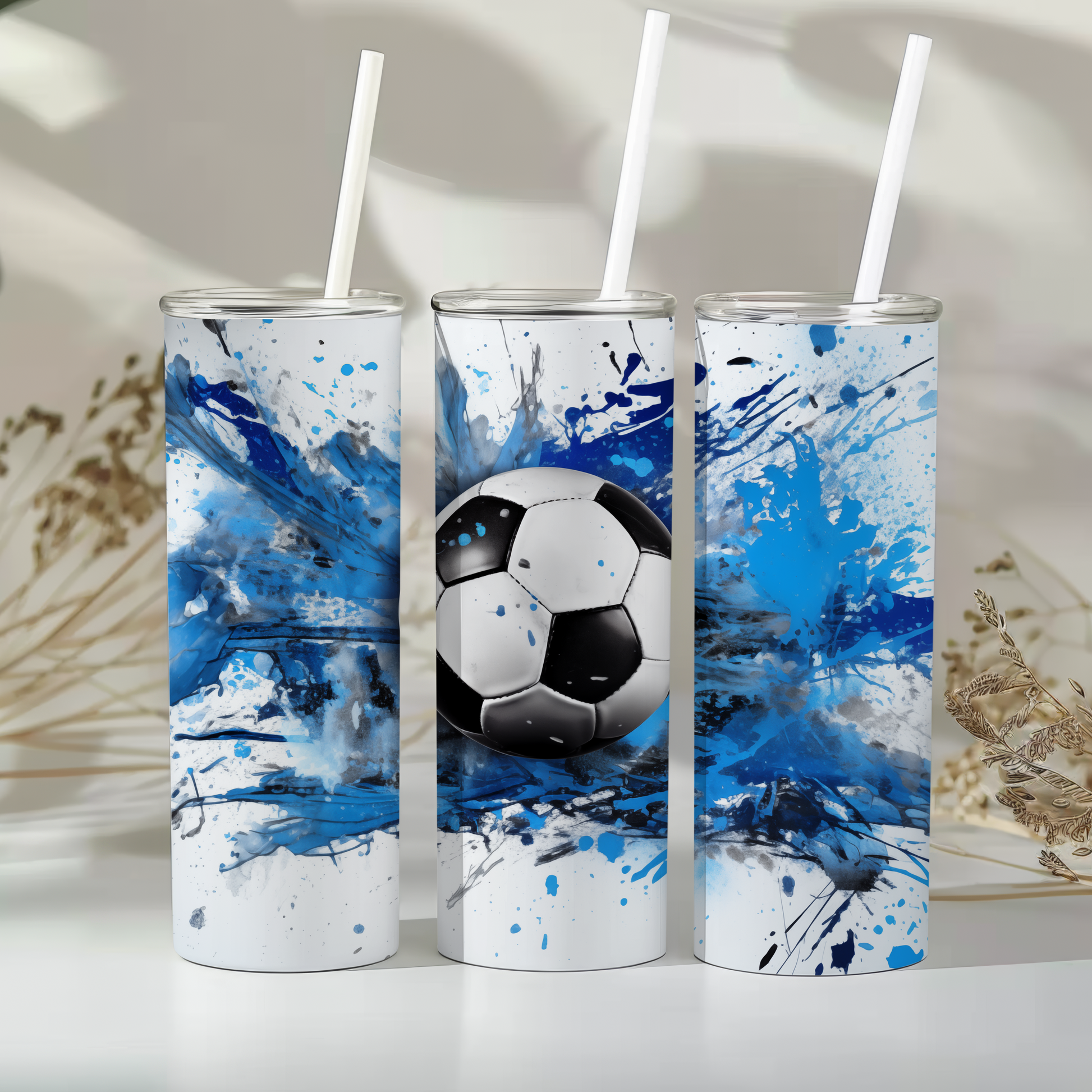 Football Tumbler – 20oz Stainless Steel Cup with Blue Paint Splash – Sports Lover Gift, Soccer Mum Cup, Game Day Vibes