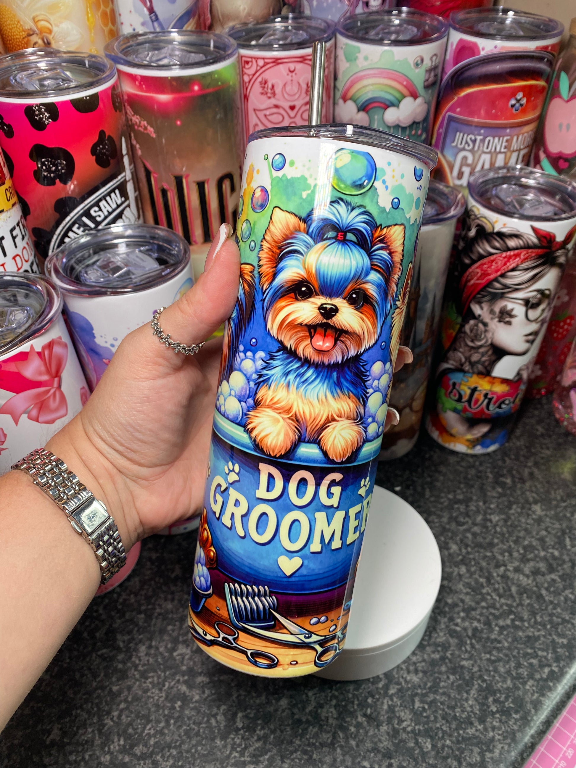 Featuring cute cartoon Yorkies in a bubbly blue bath, rainbow shampoo bottles, grooming tools, and the bold “Dog Groomer” design front and center – this 20oz tumbler is made to stand out in the salon or on the go.