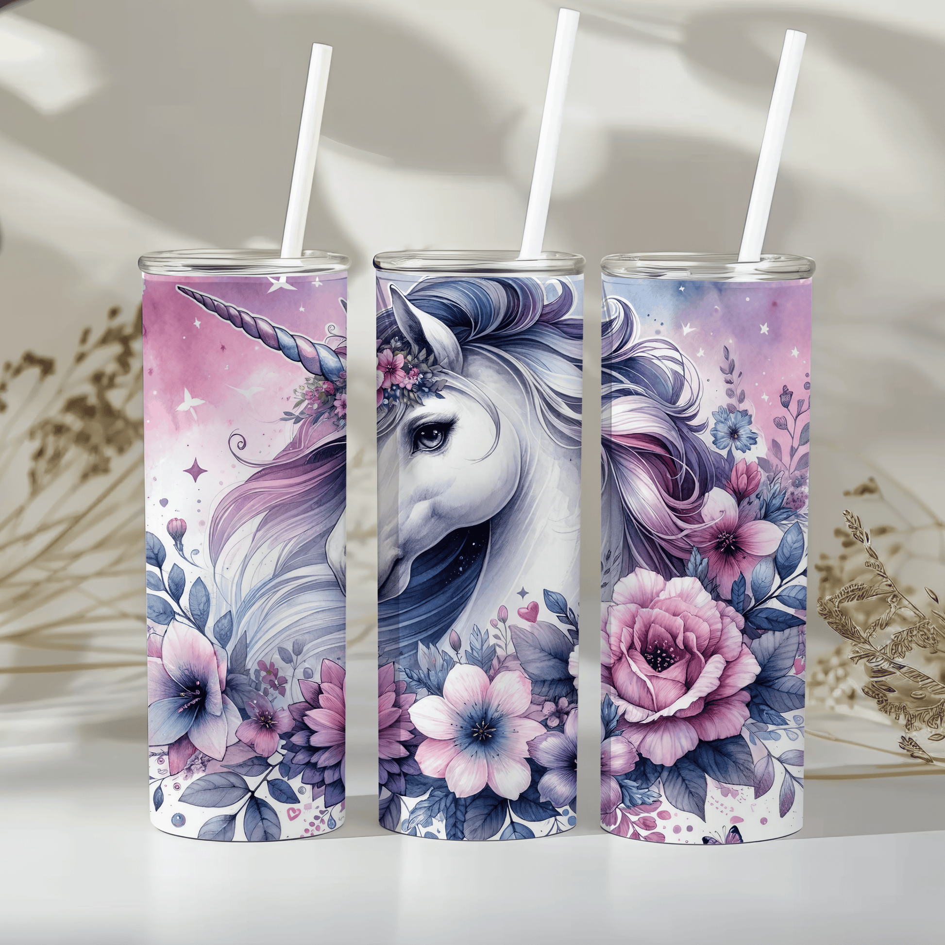 ✨ Sip in style and believe in the magic with this dreamy Unicorn Tumbler! Featuring a stunning unicorn head surrounded by soft pastel flowers, this tumbler is what fairytales are made of – perfect for those who never outgrew their love for all things sparkly, sweet, and whimsical.