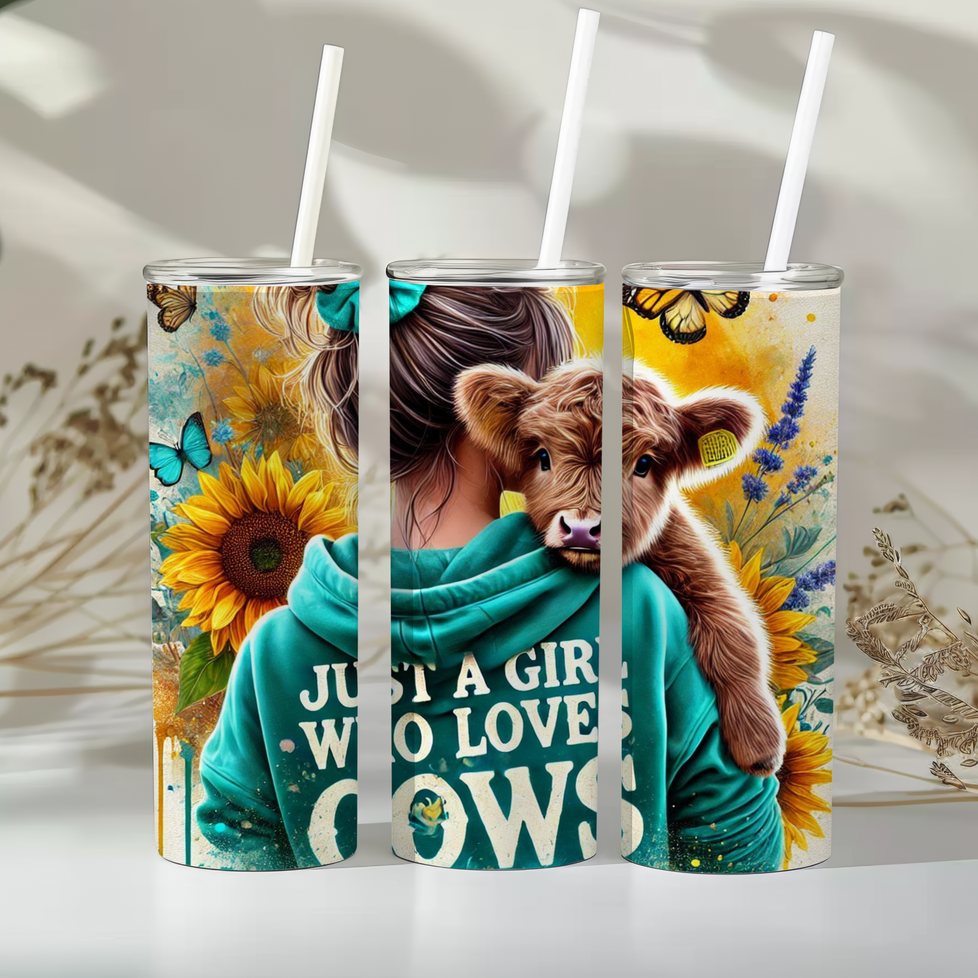 This 20oz stainless steel tumbler is as adorable as it is practical — featuring a beautiful country-inspired design of a girl hugging a fluffy calf, surrounded by sunflowers, butterflies, and rustic charm.