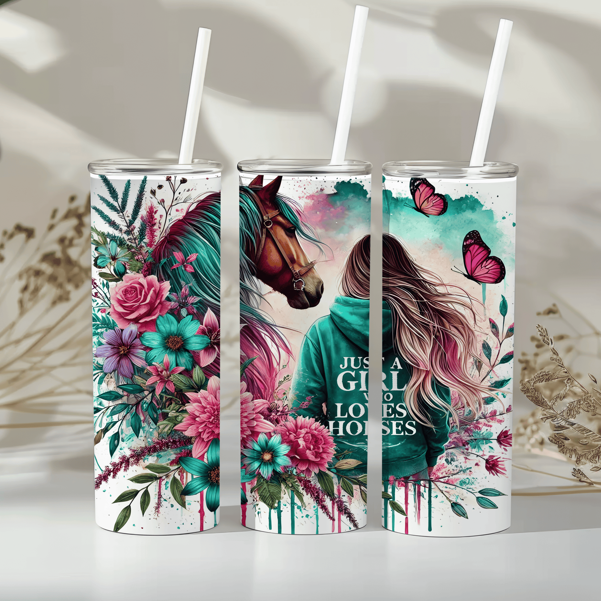 “Just a Girl Who Loves Horses” Tumbler — 20oz of Pure Sunshine & Saddlebags ☀️🐴 🌸🪻