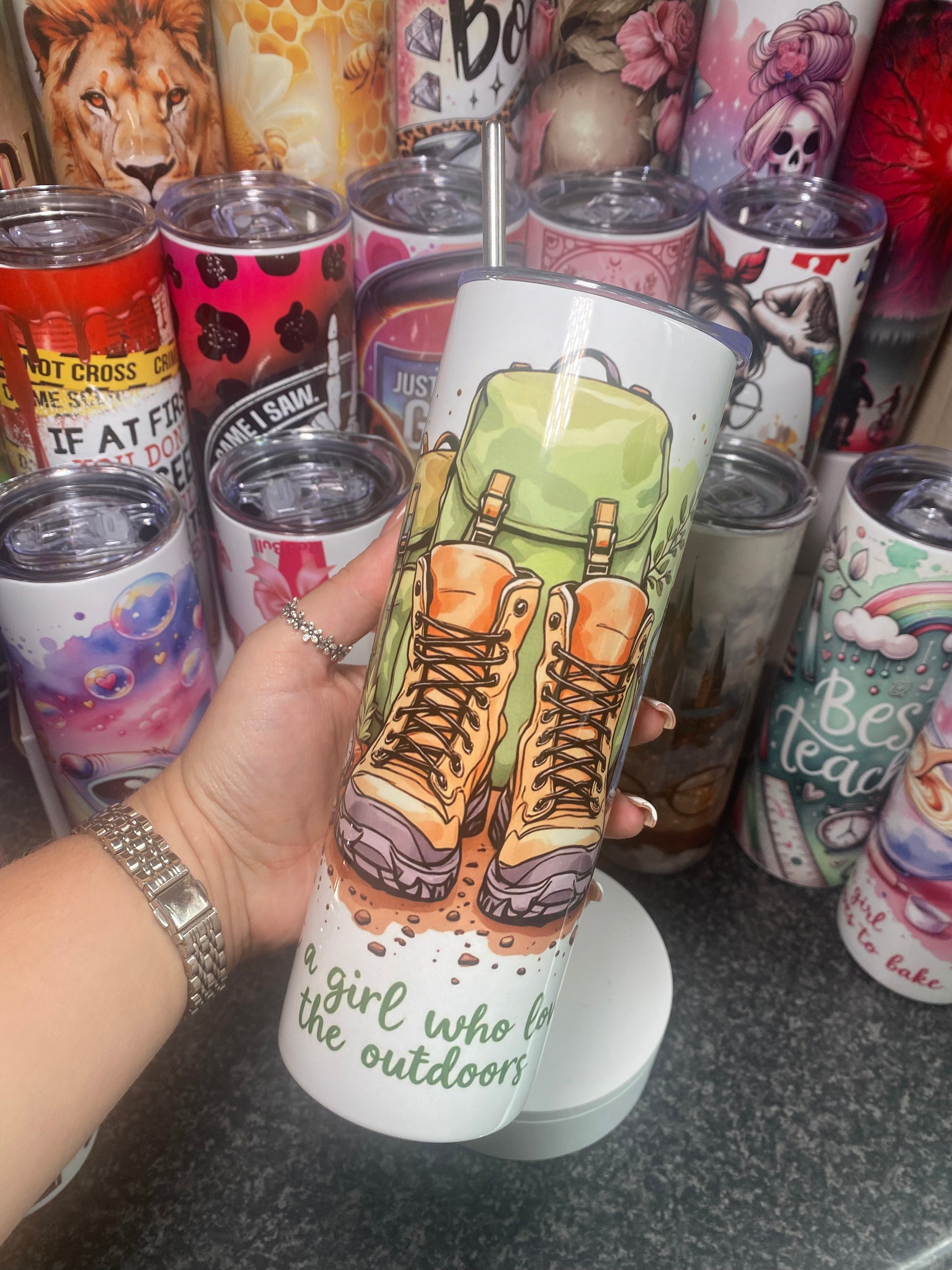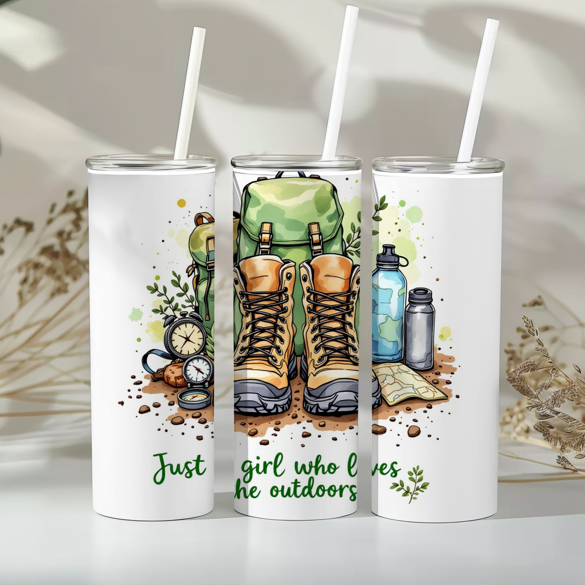 Just a Girl Who Loves the Outdoors Tumbler – 20oz Hiking-Inspired Stainless Steel Travel Cup with Boots, Backpack & Map – Adventure Lover Gift