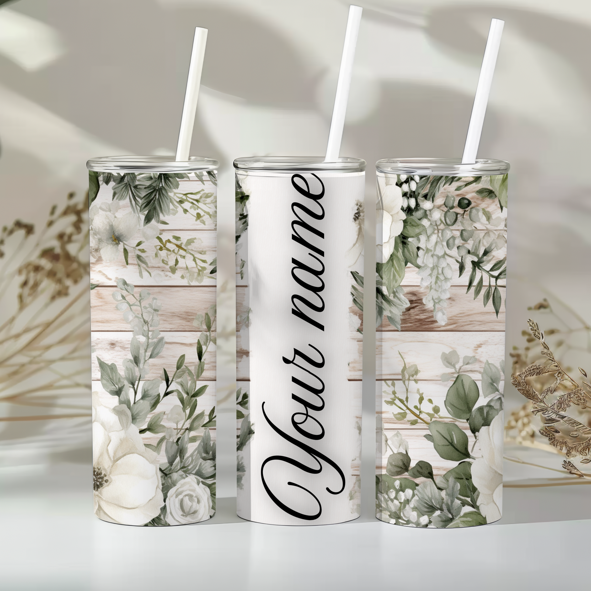 🌿🤍 Personalised Name Tumbler – 20oz White Floral & Greenery Cup | Custom Gift for Bridesmaids, Flower Girls, or Just Because 💐✨