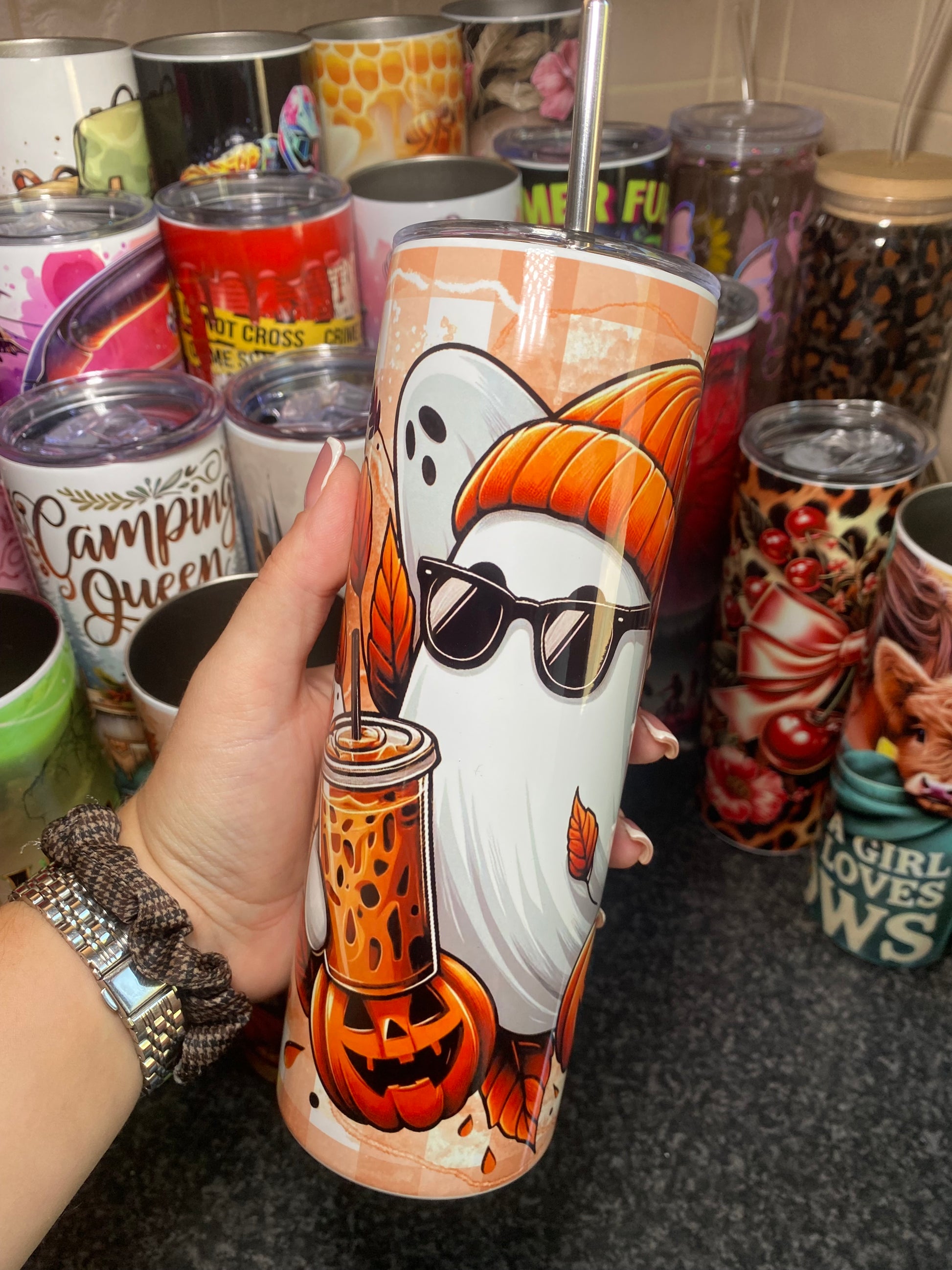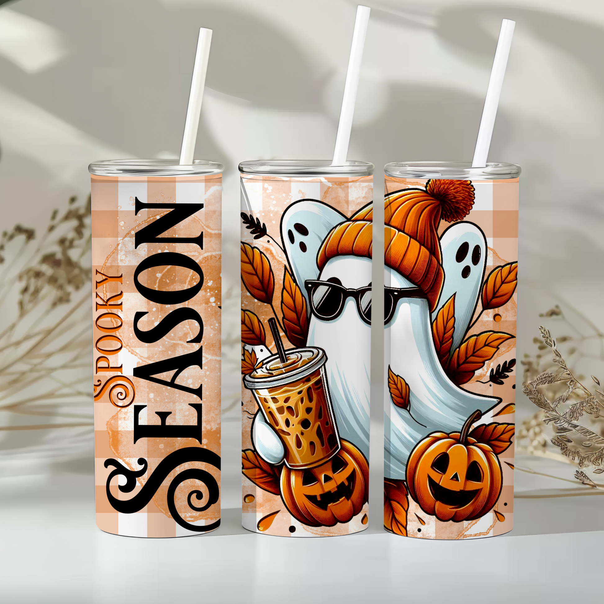 Boo, babe 👻 It’s Spooky Season and your tumbler game needs to be as bold as your pumpkin spice addiction. This 20oz stainless steel cutie features a chilled-out ghost in sunnies and a beanie (because obviously), surrounded by pumpkins, leaves, and bubble tea realness 🍁🎃